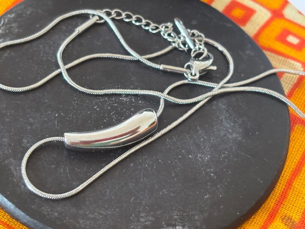 Design: Features a sleek, curved bar pendant attached to a delicate snake chain. This is a minimalist and modern piece of jewelry.